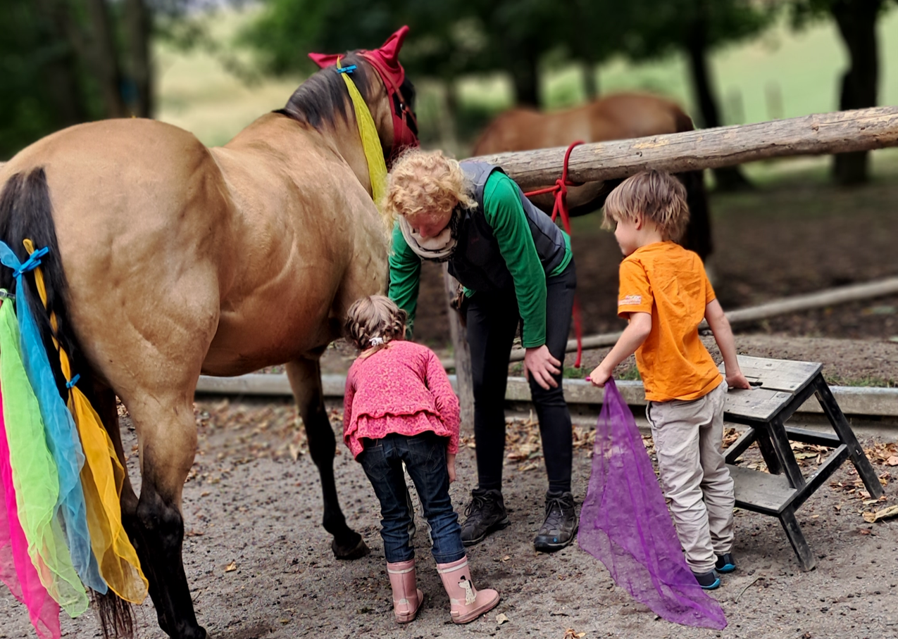 Unser Tag begann mit einer herzlichen Begrüßung in der Scheune. Hier stellten wir uns vor und erklärten den Ablauf des Vormittags. Danach lernten die Kinder unsere Pferde kennen und durften sie putzen und mit bunten Bändern schmücken. Dies half den Kindern, eine Verbindung zu den Tieren aufzubauen.